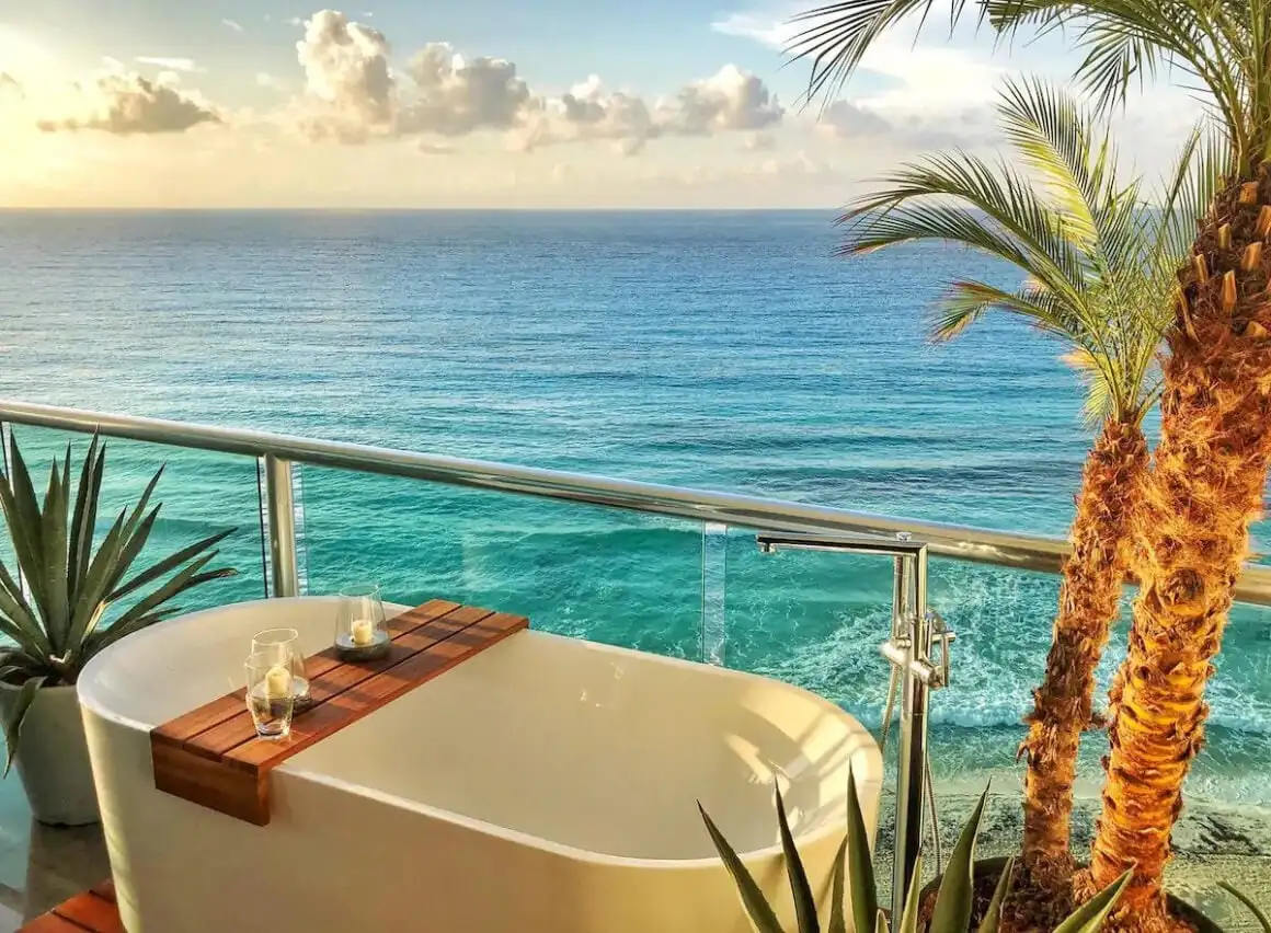 آخری لیکن کم از کم، آئیے کینکون میں بہترین لگژری Airbnb کو دیکھیں۔ ہوٹل زون میں یہ پینٹ ہاؤس ایک شاندار کھلے منصوبے کے رہنے اور کھانے کے کمرے، ایک کشادہ بیڈ روم، اور میرا ذاتی پسندیدہ، بالکونی میں ایک باتھ ٹب کے ساتھ آتا ہے جو سمندر کو دیکھتا ہے۔